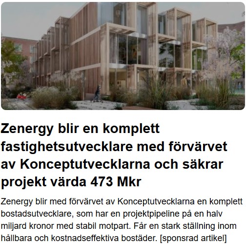 Zenergy blir med förvärvet av Konceptutvecklarna en komplett bostadsutvecklare, som har en projektpipeline på en halv miljard kronor med stabil motpart. Får en stark ställning inom hållbara och kostnadseffektiva bostäder. [sponsrad artikel]